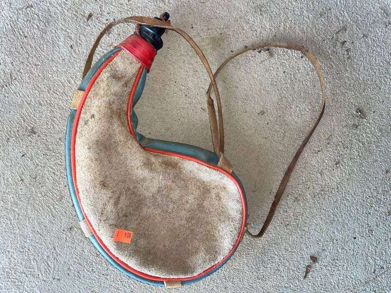 Soft-sided water flask featuring leather and fabric construction with a plastic spout and cap. Includes a strap for carrying and measures approx. 14 in. length.