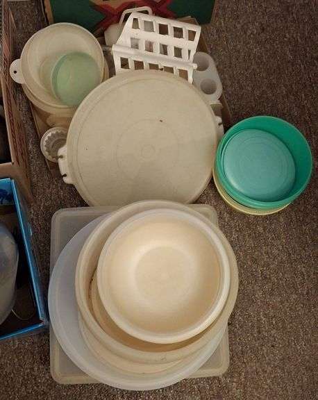 Plastic storage containers, bowls, lids, ice cube tray, and measuring cup inc. various sizes and shapes.