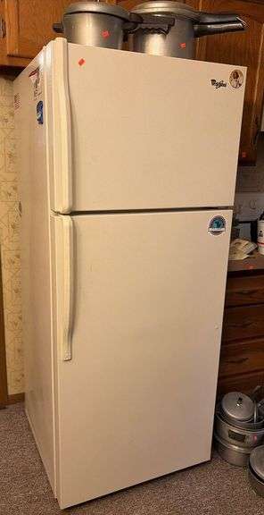 Whirlpool top-freezer refrigerator with a white finish, measuring 28”x31”x67”. Interior includes adjustable shelves, door compartments, and freezer section.