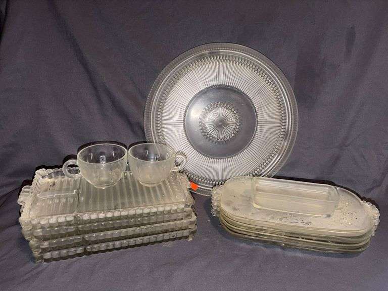 Clear pressed glass collection inc. 4 platters (9.5 in.), 4 serving trays (8 in.), 2 cups, and a rectangular covered dish. Designs include sunburst and ribbing patterns with handles.
