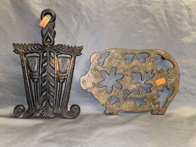 2 cast-iron trivets, one pig-shaped with floral cutouts and the other featuring stylized broom designs. Both include mounting holes on the reverse. Approx. 8 in. length.