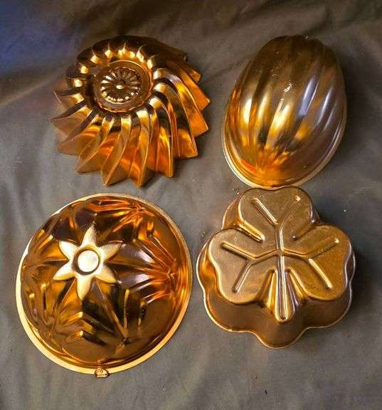 4 copper-tone metal baking molds with varied designs, Inc. star and clover shapes. Each mold ranges 6"-8" in size. Minor surface wear visible.