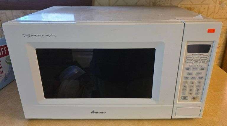 Amana Radarange microwave oven, Model AMC2206BAW06, manufactured June 2011 in Malaysia. Features standard microwave controls, a turntable interior, and a white finish. Measures 23.5″ x 17″ x 13″.