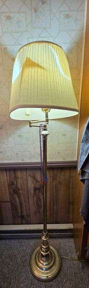 Brass-tone floor lamp featuring a pleated fabric shade and adjustable swing arm. Includes decorative beaded chain. 61″ tall.