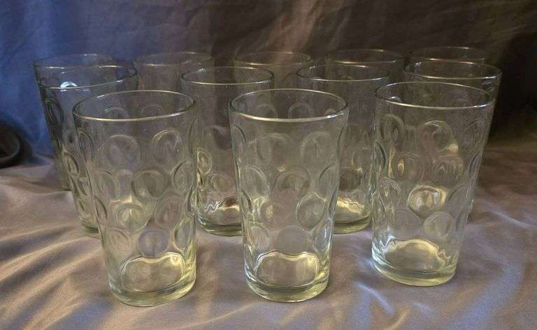 12 clear glass tumblers featuring a circular pattern design on the sides. Each stands 5″ H. Textured exterior enhances grip.