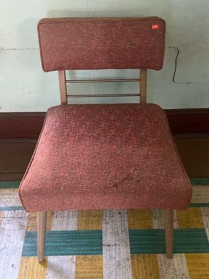 Armless chair featuring a red geometric-patterned upholstered seat and backrest, complemented by a wood frame with horizontal metal back supports.
