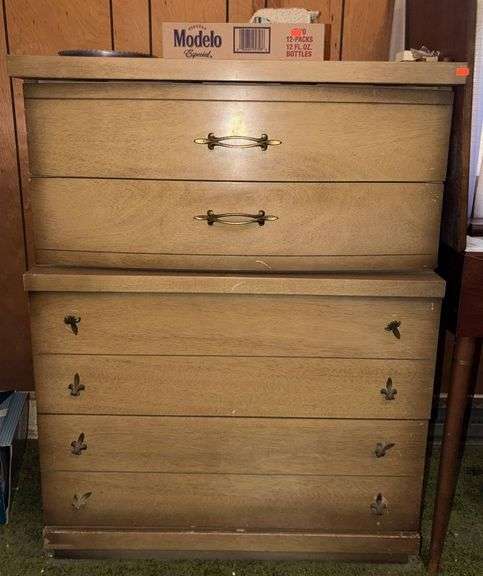 Bassett Furniture dresser featuring 5 drawers with metal handles and accents. Dimensions 32”x19”x43”. Items shown on and in the dresser are not included.
