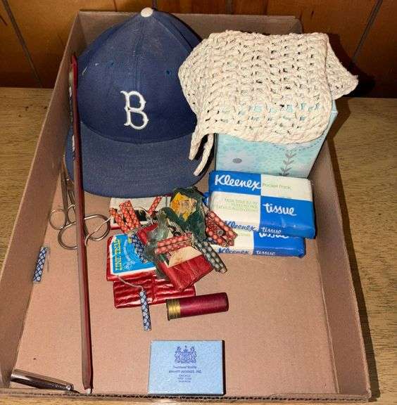 A blue baseball cap with ‘B’ emblem, multiple vintage firecracker packs, small tissue boxes, a crochet hook with case, scissors, sewing needles with case, and additional unidentified items.