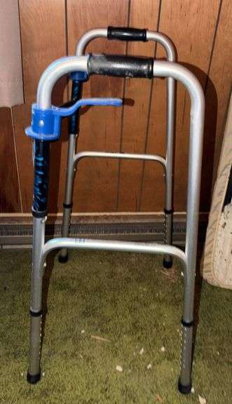 Drive walker featuring adjustable height settings, aluminum frame, and padded hand grips. Includes blue plastic support brackets.