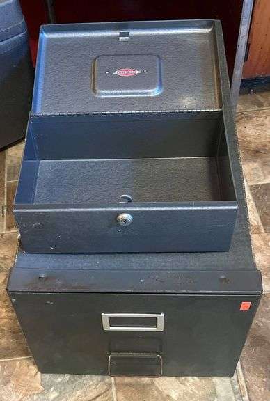Craftsman branded metal file box with a locking lid and separate storage drawer. Includes top box with carrying handle, latch closure, and durable construction. The drawer beneath features a pull handle for easy access.