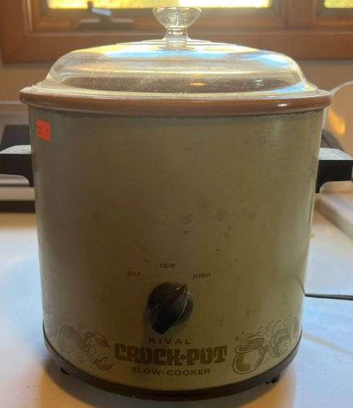 Rival Crock-Pot slow cooker, Model 3100/2, featuring a removable ceramic insert, glass lid, and manual control knob. Operates at 75-150 watts. Measures 9” x 8.5” x 8.5”.