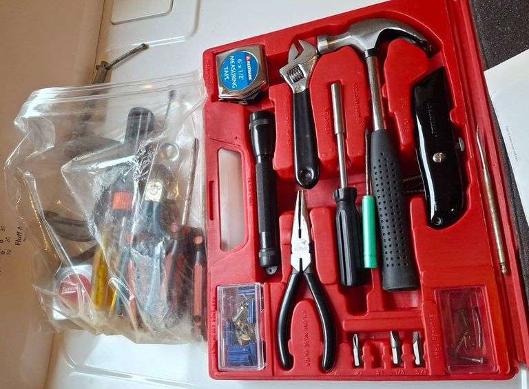 Plastic red carrying case with an assortment of tools Inc. a hammer, pliers, adjustable wrench, screwdrivers, utility knife, flashlight, and measuring tape. Some additional screws and bits included in storage compartments.