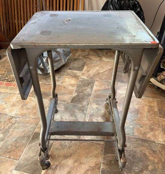 Metal utility table featuring folding drop leaves on each side. Sturdy frame on 4 casters for mobility.