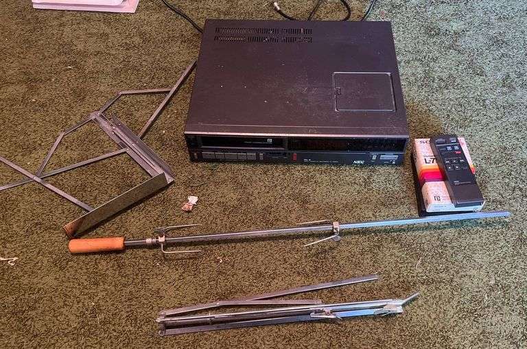 NEC VC-N20EU cassette recorder with rear VHF and audio connections, Sony L-750 Beta cassette, rotisserie components with chrome rods and wood handle. Dimensions 4” x 6.5” - 14.5” x 16”.