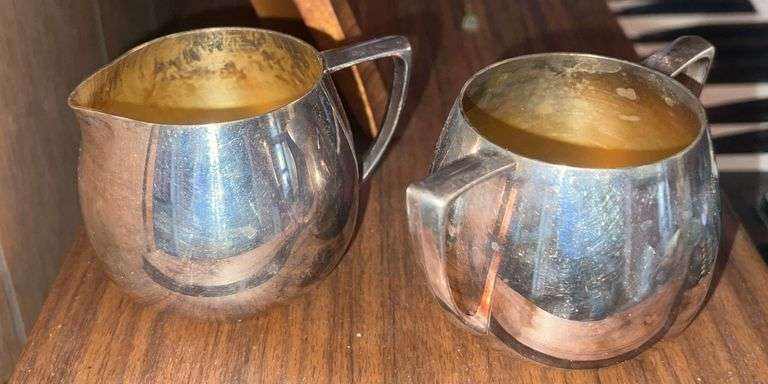Silver-plated creamer and sugar bowl featuring a gold-tone interior finish. Includes original box from the brand ‘Nobility Plate.’