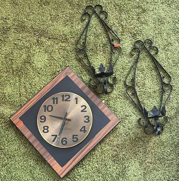 Seth Thomas 12” square wall clock, model E685-132 Midtown, with wood veneer and brass-tone face. Includes 2 black metal wall-mounted candle holders, each measuring 19”. Clock marked by Talley Industries on reverse casing.