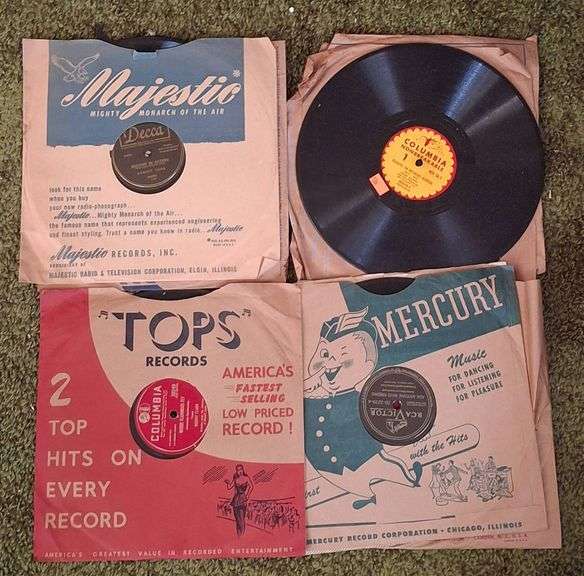 Shellac records in paper sleeves. Labels include Decca, MGM, Mercury, Majestic, and others. Tracks feature artists such as Ernest Tubb, Hank Williams, and Ames Brothers.
