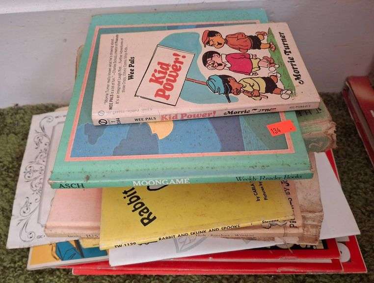 Children’s books, including titles like ‘Kid Power!’ by Morrie Turner, ‘Moongame’ by Frank Asch, and various TIME magazine issues from different years.