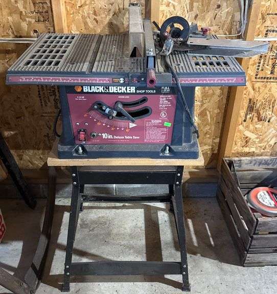 Black & Decker 10-in. deluxe table saw with 2.5 HP motor. Features adjustable blade angle gauge, metal table, and a mounting stand. Includes components visible in photos.