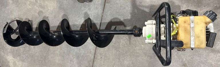 Gas-powered earth auger featuring a helical drill bit and sturdy grip frame. Includes motorized engine assembly with fuel tank and integrated safety labels.