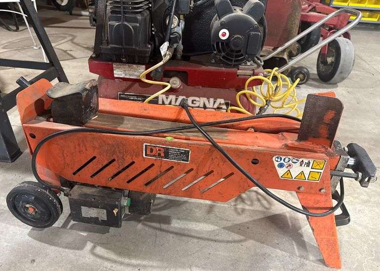 DR Power log splitter with an electric motor. Includes visible wiring and operational controls. Made in China with 230V, 15A specifications.