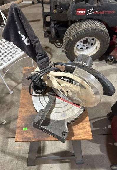 Pro-Tech 7203 compound miter saw with an 8-1/4” blade. Includes table measuring 30”x15.5”x19”. Blade guard and dust bag attached. Powered by 120V motor with 5000 RPM. Made in Taiwan.