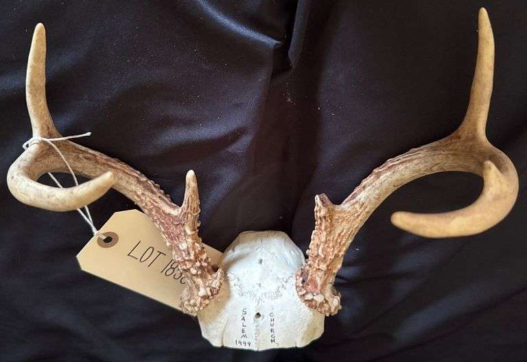 Mounted deer antlers measuring approximately 14 in. wide, attached to a partial skull bone. Ideal for display or taxidermy projects.