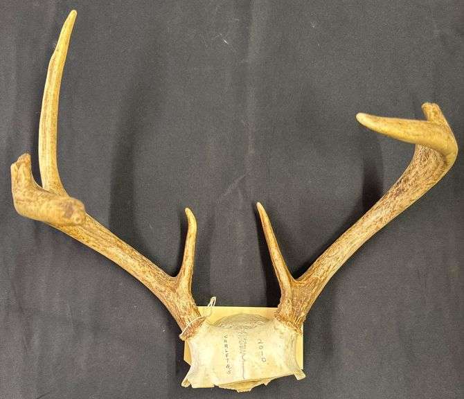 Deer antlers mounted on a partial skull plate with natural texture and aged finish. Measurement shown as approx. 16 in across the widest span.
