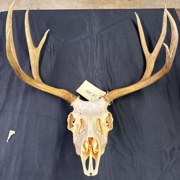 Cleaned whitetail deer skull with an 8-point antler configuration. Skull is intact with symmetrical antler growth and a natural bone finish. Approximate antler spread measures 18 in.