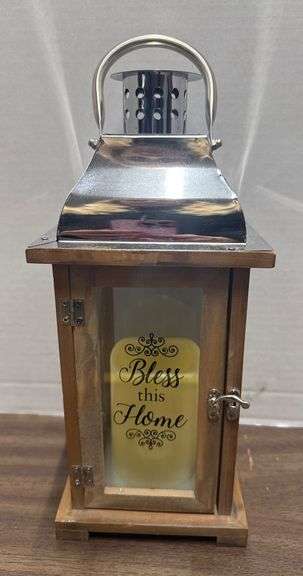Lantern featuring a 15″ tall design with a metal top, glass panels, and a hinged door. Includes a yellow candle and “Bless This Home” inscription on one panel.