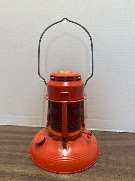 Red Dietz lantern with embossed ‘City of Milwaukee’ text and a glass globe. Measures 14” tall. Features a wire handle and embossed branding.