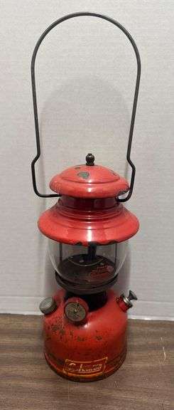 Coleman red lantern featuring a Pyrex globe, Model 200A, marked ‘Used on 200A 6/61.’ Measures 19.5” tall.