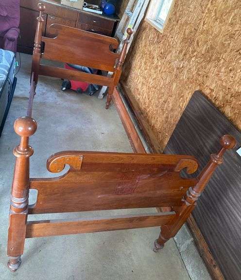 Twin bed frame constructed of turned wood, measuring 42” wide. Each frame includes a footboard, headboard, and side rails with decorative finials.
