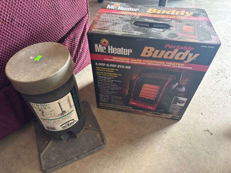 Mr. Heater Portable Buddy indoor propane heater with output of 4,000-9,000 BTU/hr in original packaging. Wildlife Feeder designed for ground-feeding birds and includes mounting base.