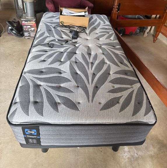 Sealy Posturepedic Plus mattress with adjustable base measuring 37 in. wide. Includes a box of accessories and manuals. Features include a textured fabric design and branded details.