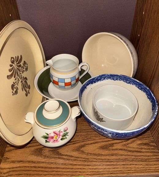 Plates, bowls, a sugar bowl with lid, a creamer, and saucers. Features various makers and designs, some marked ‘Austria’ and ‘Made in Korea.’