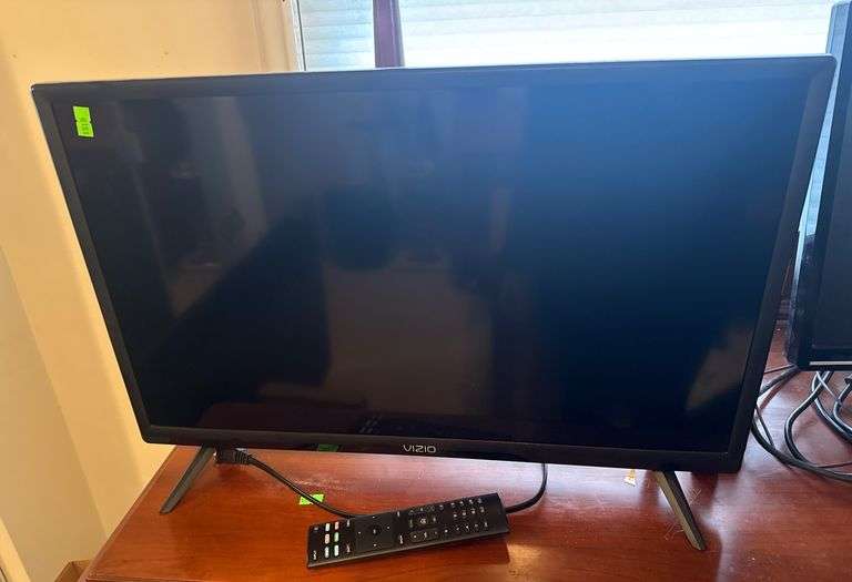 VIZIO LED TV Model D24h-G9 with a 24-inch display and remote. Features HDMI inputs, USB port, and Dolby Audio compatibility. Measures 22”x13”.