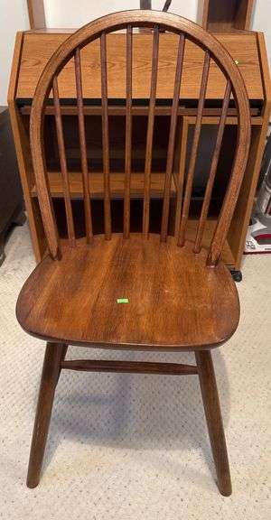 Chair featuring a curved spindle backrest and contoured wood seat. Measures 17.5 x 17.25 x 35 inches.