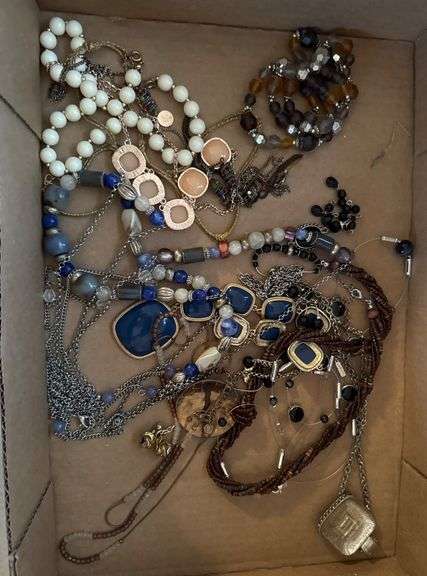 Fashion jewelry featuring necklaces, bracelets, and earrings in mixed materials with bead, chain, and stone designs. Includes various colors such as blue, brown, and white.