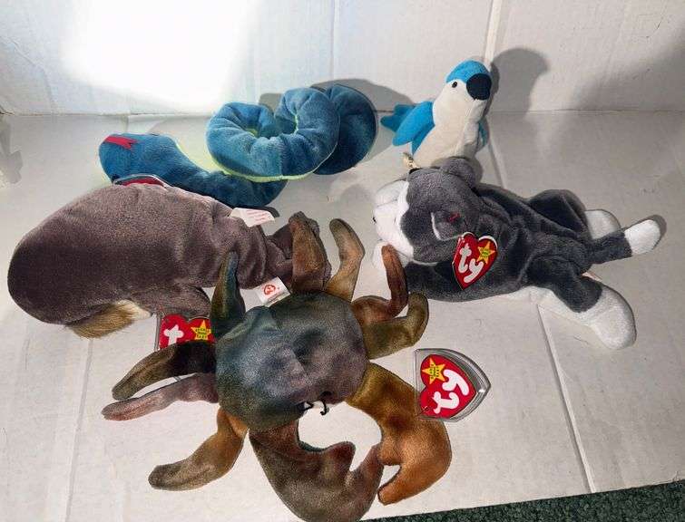 5 TY Beanie Babies soft plush toys Inc. a blue and white penguin, gray dog, curled blue snake, multicolored crab, and brown walrus. Each has a heart-shaped tag attached.