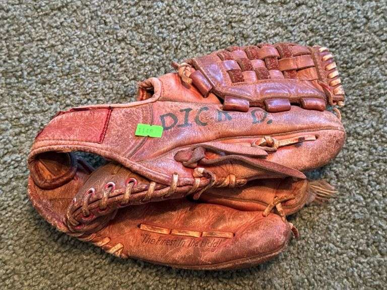 Leather baseball glove featuring laced stitching and basket-style webbing. Approx. 10 in. long based on included measuring tape.