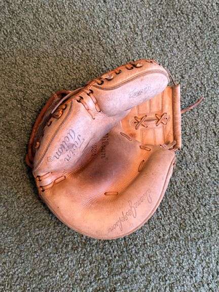 Wilson catcher’s mitt featuring leather construction, stitched details, and embossed branding. Approx. 10 in. width.