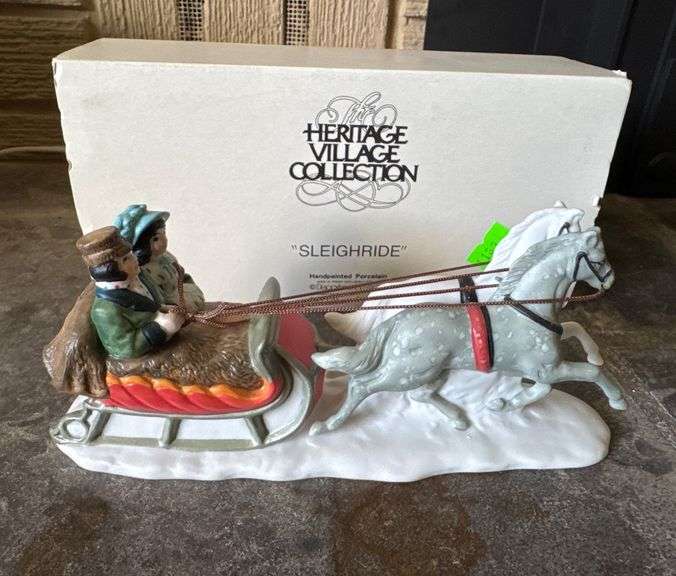 Hand-painted porcelain figurine titled ‘Sleighride’ from the Heritage Village Collection by Department 56. Features a detailed depiction of a couple riding in a sleigh drawn by white horses. Includes the original labeled box. Length approximately 12 in.