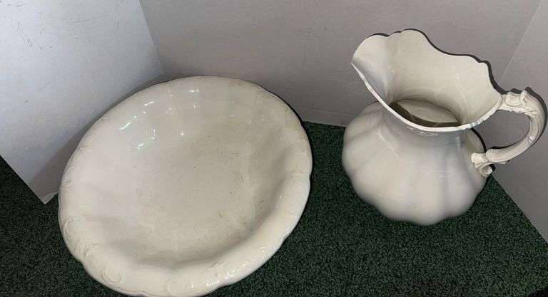 White wash basin bowl measuring 16”x4” and pitcher measuring 11.5”x10”. Both pieces feature a scalloped rim and raised floral details.