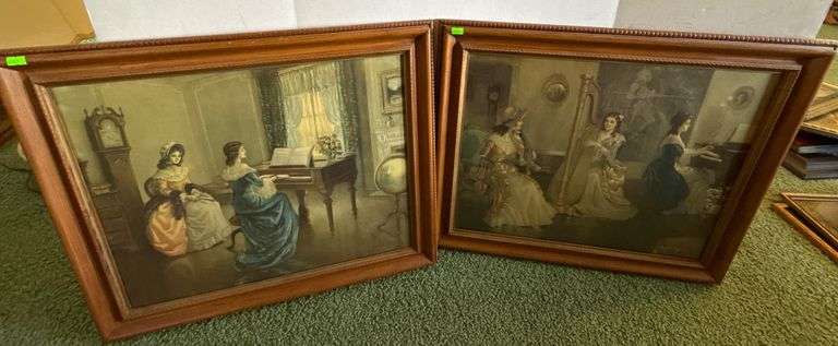 Two framed 22.5”x25” prints showing women in elegant interiors with musical instruments. Both are housed in matching wood frames.
