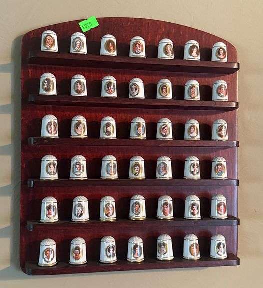 Wall-mounted rack measuring 11.5”x10”, holding thimbles. Each thimble features a detailed portrait design and is accented with gold-tone trim. Rack has 6 tiers to display thimbles securely.