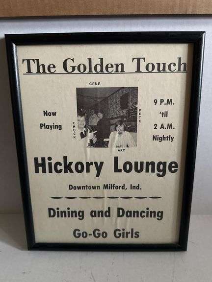 12”x9.5” advertisement poster for Hickory Lounge in Downtown Milford, Ind., featuring entertainment details and framed by Doll’s Decorating Center.