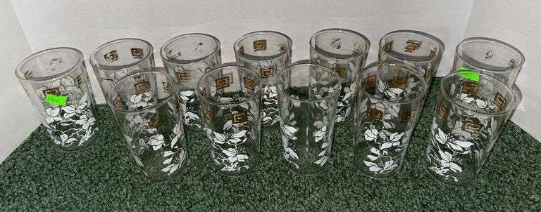 12 clear glass tumblers featuring gold geometric accents and white floral designs. Each measures 5”x3”.