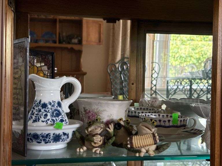 Tableware, including floral-patterned pitchers, cups, saucers, and bowls. Also includes 3 frog figurines holding musical instruments made of painted resin.