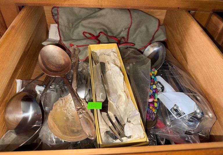 Forks, spoons, and serving utensils of mixed designs and materials. Branding like ‘Germany’ and ‘World Gold’ visible. Several pieces stored in individual plastic packaging and boxes.
